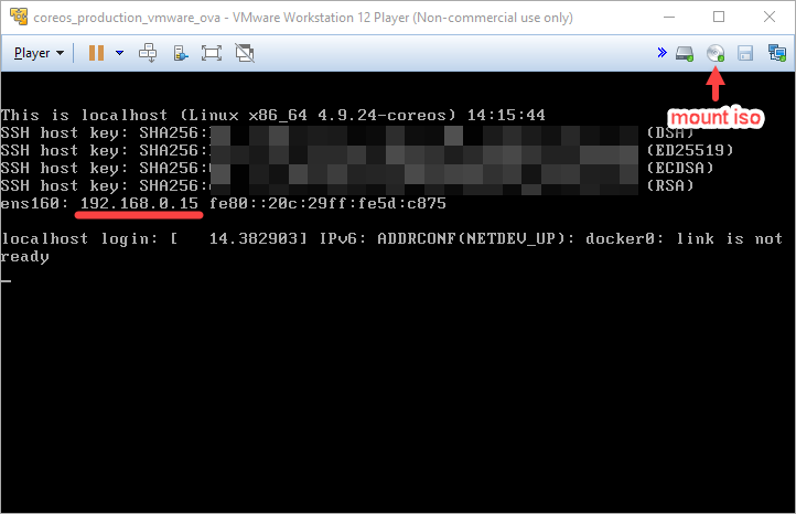 After that it is enough to attach the ISO file that we have just created to the virtual machine and start it. CoreOS will detect it and we will be able to log-in with the user core using our own private key. CoreOS doesn’t have a default password, so this is mandatory.