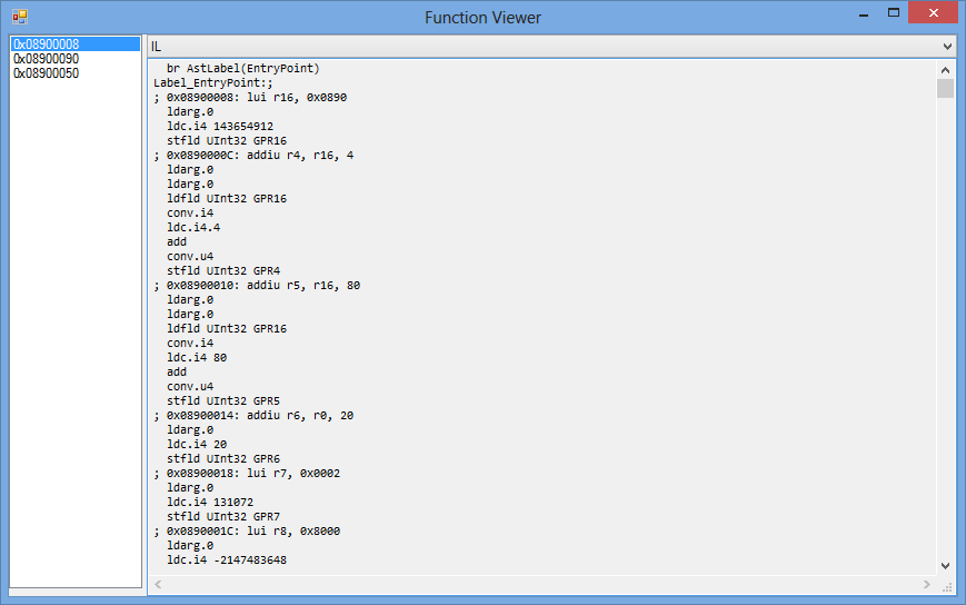 I have added a new window that allows you to see compiled functions in several formats (C#-Like, AST, IL, MIPS):