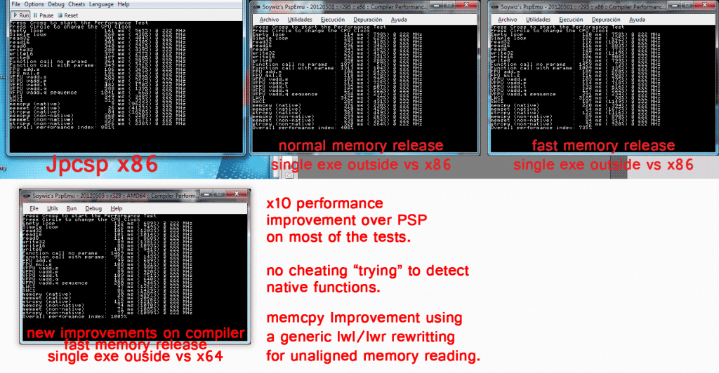 I am working on supporting x64 right now (with atrac3+ support on windows) and improving the compiler performance. Also I have improved the memcpy, memset emulator is using internally making it much faster (almost 10x). Also I have been working on improving lwl/lwr instructions that allow to read unaligned words. https://github.com/soywiz/cspspemu/issues/42