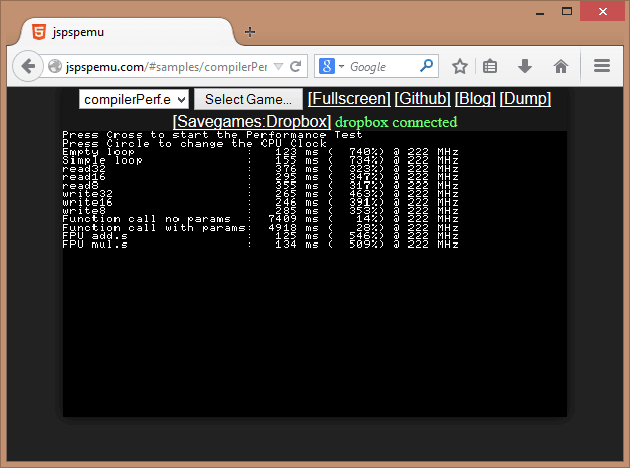 Results greater than 100% mean that will work faster than on a real PSP (in theory): http://jspspemu.com/#samples/compilerPerf.elf