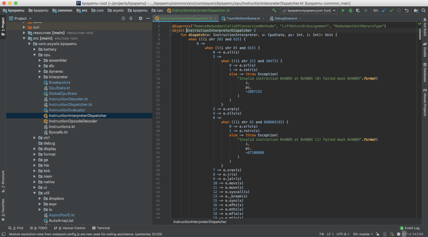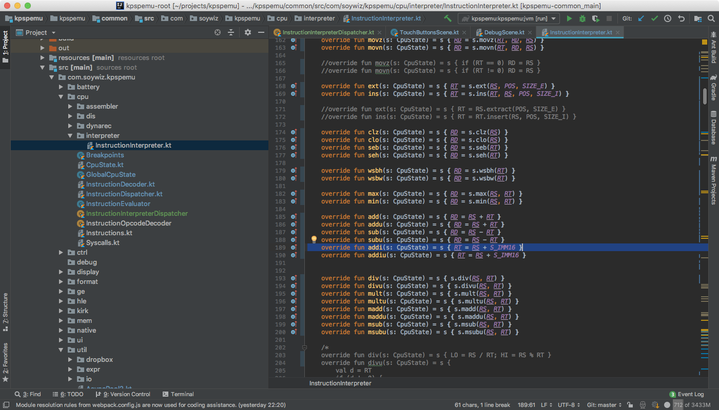 Also features an initial multiplatform dynarek in addition to its interpreter. The dynarek project allows to generate an AST, and to generate JavasScript when targeting JS, and JVM bytecode when targeting Java. Also supports an interpreted mode for other targets as fallback, but it is even slower than interpreting the PSP right now. The idea is to generate at least X64 and ARM code later for Native.