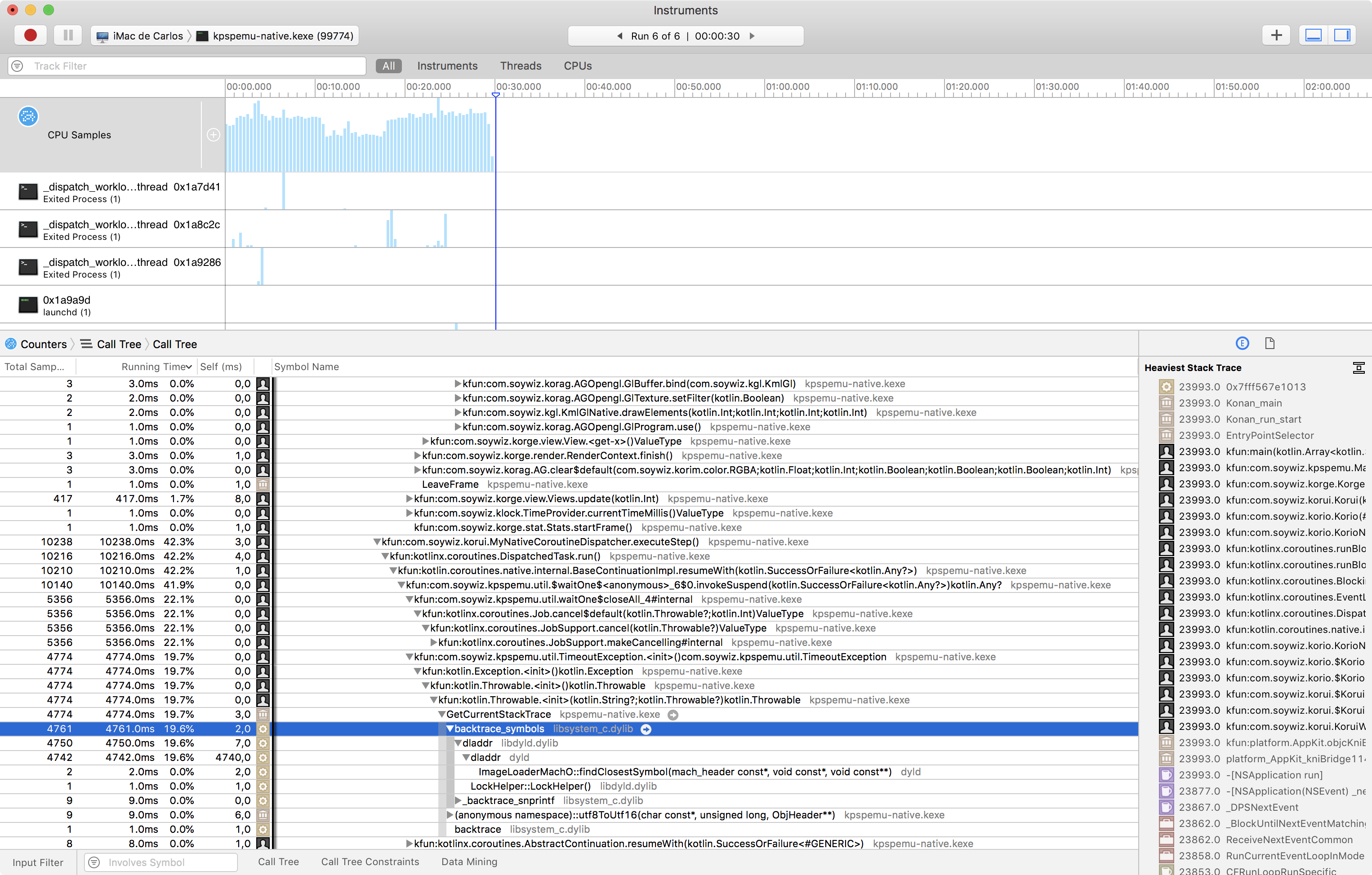 I was launching a lot of exceptions, since I had a mechanism to wait for a Signal with a timeout when the timeout triggered it cancelled a coroutine Job. But I was doing this a lot of times. In JVM and JS instantiation a exception is super cheap. But with K/N is super expensive. It is because it calls the backtrace_symbols C function, that seems to get the stacktrace information even if you don't need it. Probably would be enough to get a list of pointers to functions from the stack, without resolving them. And resolve them lazily if you happen to ever print the stacktrace that was not the case. Not sure if calling backtrace instead and then manually calling dladdr when required would work. But right now it is expensive.