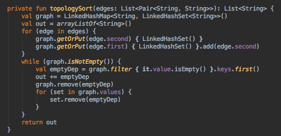 The topology sort is used for sorting dependencies. It work on a digraph without cycles. The unoptimized but simple version looks like this: