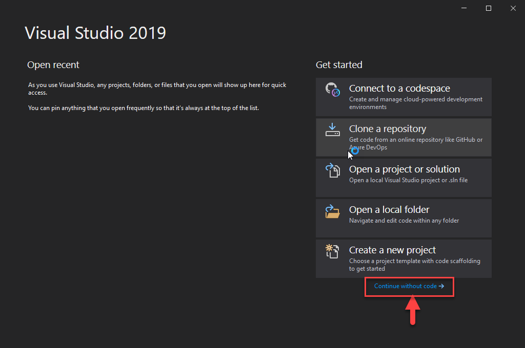 Once Visual Studio 2019 is installed, now we can open it. And click on Continue without code: