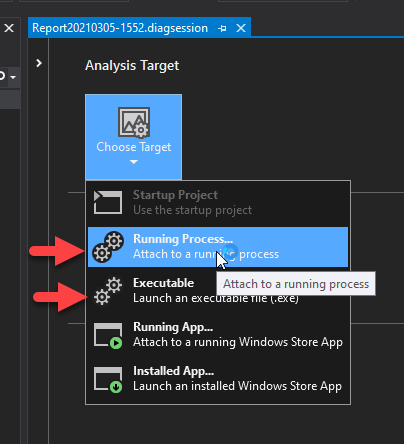 Then we select either a Running Process... or an Executable to profile from the start of the app: