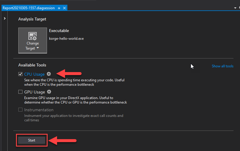 After that we select CPU Usage and click on the Start button: