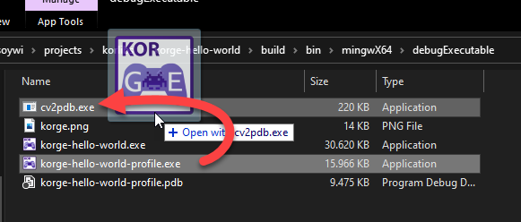 This tool modify the executable stripping the DWARF information by default, so I suggest you to duplicate the executable. Then you can call the cv2pdb.exe tool via terminal, or just dragging your executable into cv2pdb.exe: