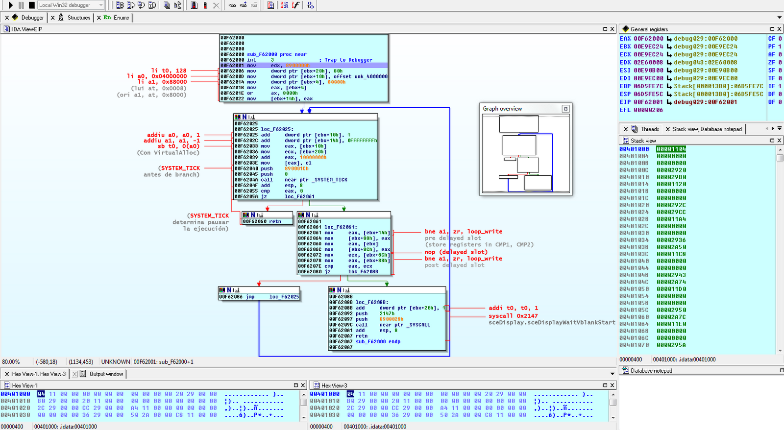 The idea is simple: stop the execution once you reach a dynamically generated block of code, and go step by step checking out if everything works as expected. To stop at that point, yo can do it manually, or do it as I'm doing right now for this case: I'm detecting if there is an attached debugger to the debugger, and if it is, I'm emitting interruption 3 just before starting the code block. Interruption 3 is a software breakpoint. The debugger stops there automatically, so we don't need to know the address beforehand.